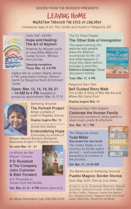 Cady Hall artwork exhibit by refugee youth at Casa Alitas Welcome Center Tucson on display 10am-4pm, March 12, 13, 14, 19, 20, and 21. Opening reception on Thursday, March 12 from 5-8pm includes a gallery talk by curator Valarie James, a presentation, and refreshments provided by the Patagonia Youth Enrichment Center. Event is part of Voices from the Border’s two weekend town-wide art event, Leaving Home: Migration Through the Eyes of Children.