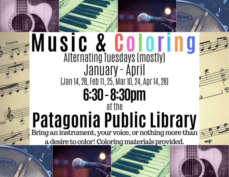 Music & Coloring Night is back at the Patagonia Public Library! Stop by on alternating Tuesdays (mostly, exact dates on flyer), from 6:30PM to 8:30PM and get your jam on, sing to the jam, or just listen and color. Bring an instrument if you want to get in on the action. For those who wish to color, materials will be provided, including adult skill level coloring pages and books, high quality Prismacolor colored pencils, colored ink pens, and markers. No registrations or sign ups required, just show up and participate with community musicians singing and playing a selection of classic standards, contemporary cover songs, and traditional folk tunes. Leave the kids, grand kids, nephews, and nieces at home and come enjoy some grown up musical fun at the Library!