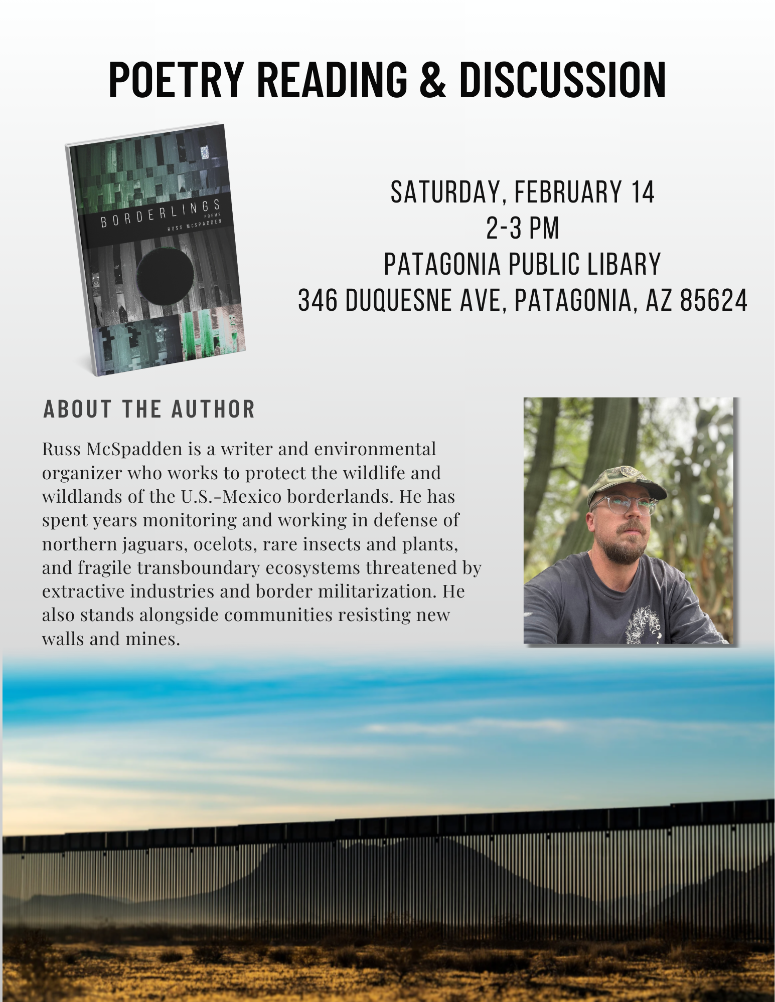 Join Russ McSpadden for a poetry reading and conversation celebrating his new book Borderlings. Through verse and reflection, Russ explores life, love, and resistance in the San Rafael Valley—and his frontline advocacy against the border wall. A powerful event at the intersection of poetry and place. Russ McSpadden has spent years monitoring and working in defense of northern jaguars, ocelots, rare insects and plants, and fragile transboundary ecosystems threatened by extractive industries and border militarization. He also stands alongside communities resisting new walls and mines. Borderlings is his debut collection.